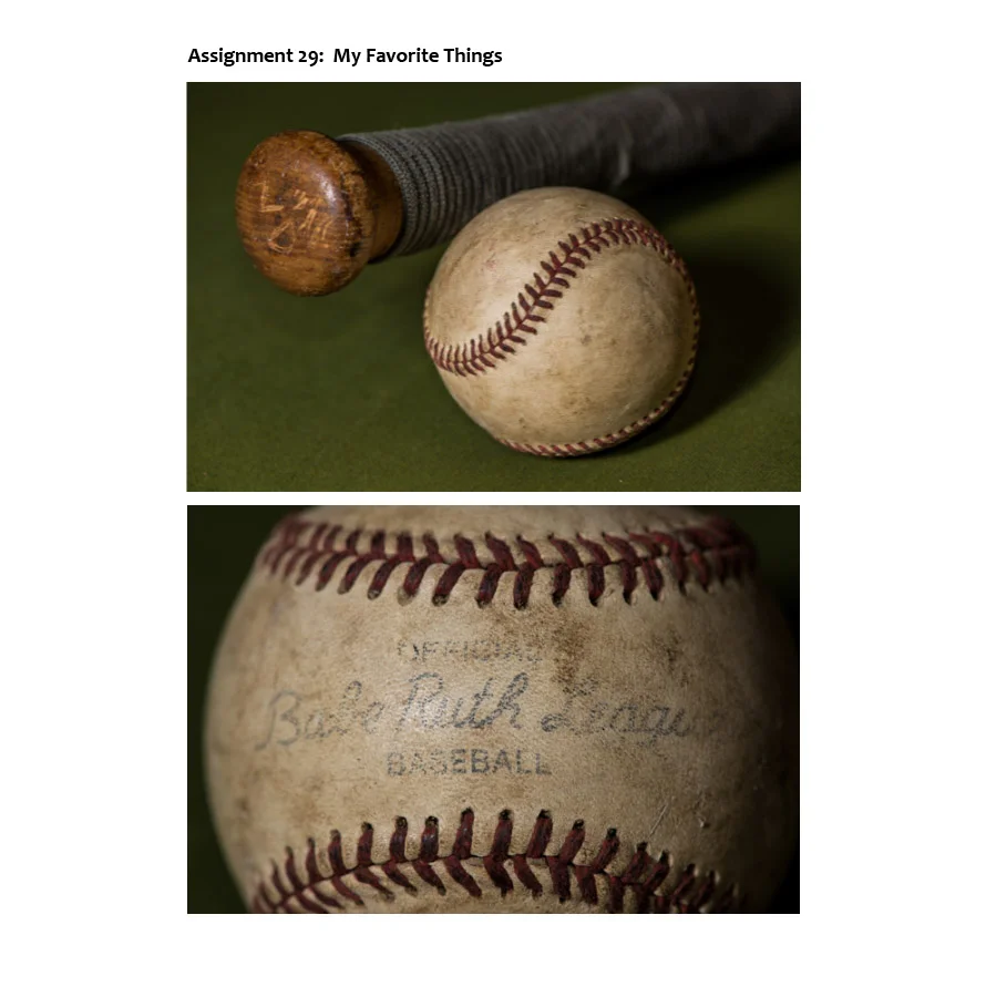 I like that the equipment is used as it adds life and character. If you look close enough you will see that the bat is old enough to have a wrapped cord for a hand grip instead of flat leather tape. While these shots may not win any awards they were fun to shoot and definitely representative of my favorite things.