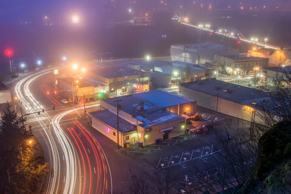 I really like how this photo turned out. The car trails, sweeping curve and bridge in the distance create a pathway for your eyes, and there are little nuggets all along the way. I love the look of the contrasting red and white of the car lights, and the glow of the city, and there is just enough of the bridge visible to tell what it is.